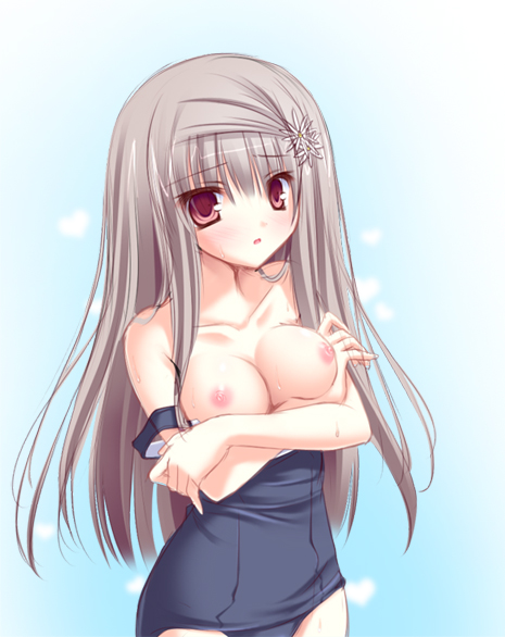 00s1girlbreastsbrown hairclothes pullcollarbonecrossed armsfemale focuslong hairlooking at viewernipplesone-piece swimsuitone-piece swimsuit pullred eyesschool swimsuitsoloswimsuit