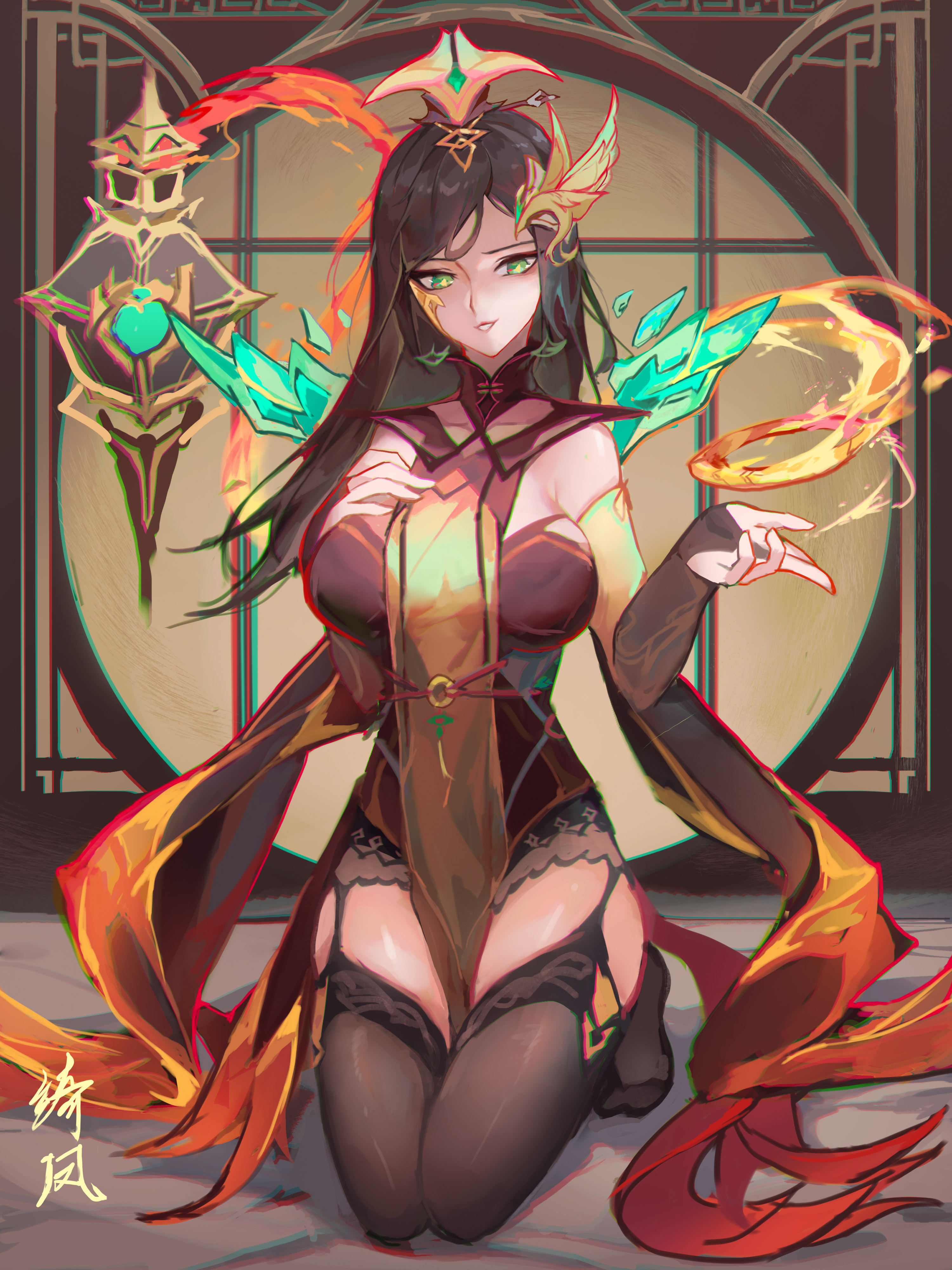 eruruu, utawarerumono, official art, official wallpaper, 00s, 1girl, animal ears, black hair, copyright name, detached collar, feet in water, female focus, flower, forest, grass, hair ribbon, horse ears, horse girl, horse tail, japanese clothes, japanese text, kimono, layered sleeves, long hair, looking at viewer, nature, ponytail, ribbon, river, solo, tail, water, yellow eyes, yellow flower