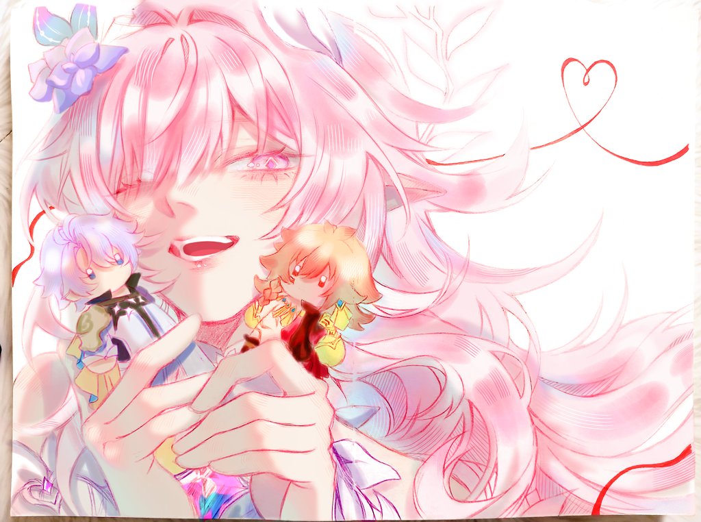1girlcharacter dolldiamond (shape)diamond-shaped pupilsdolldressflowerhair flowerhair ornamenthaloholdingholding dolllong hairlooking at viewerphel2084463pink hairpurple eyessimple backgroundsmilesolosymbol-shaped pupilsupper bodyvery long hairwhite backgroundwhite dress