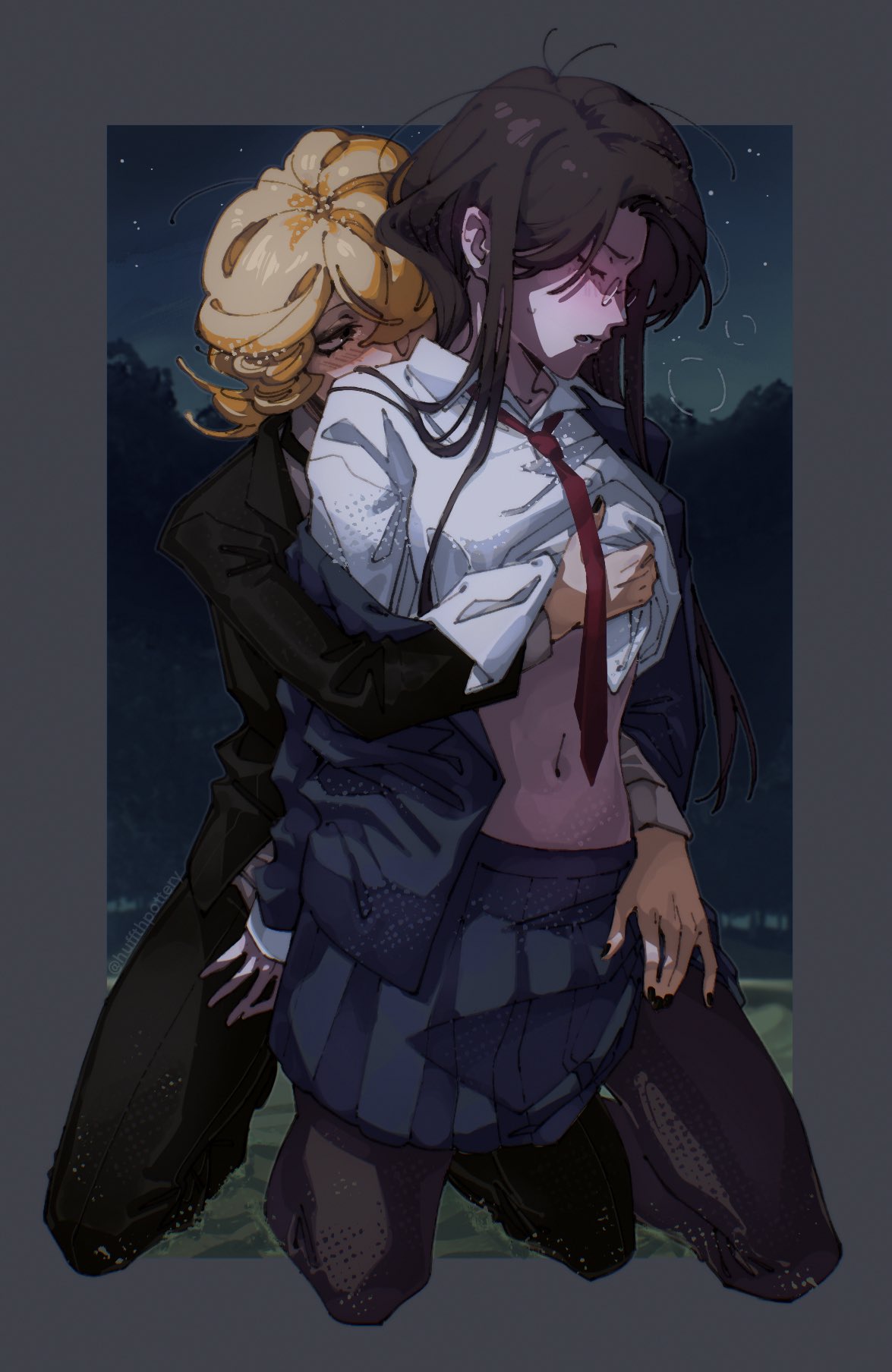 2girlsblack nailsblack pantyhoseblack skirtblonde hairblushbreathbrown hairclothes liftcollared shirtgenderswapgenderswap (mtf)glassesgrabbing another's breastgropinghand on another's thighkneelingmultiple girlsnecktienightoutdoorspantyhosepleated skirtred necktieschool uniformshirtshirt liftskirtwhite shirtyuri