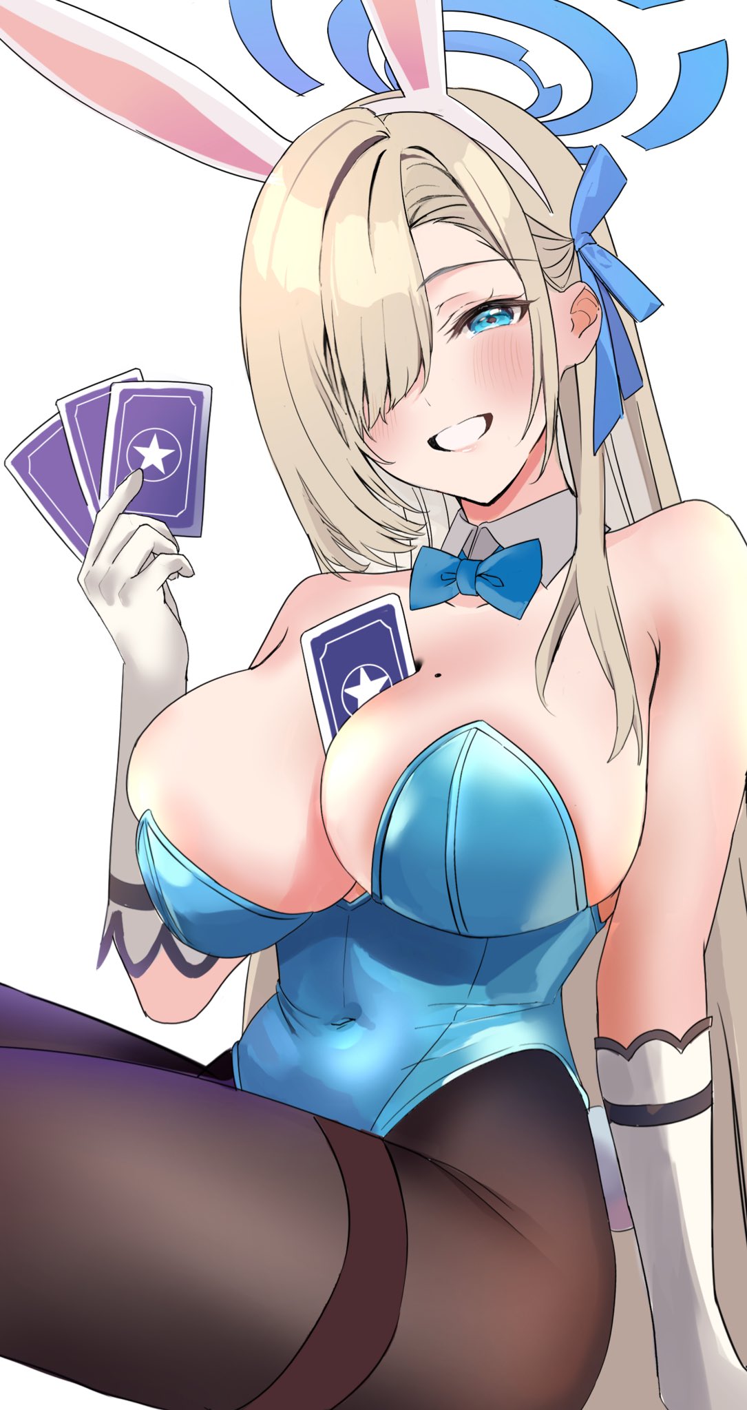 1girlbare shouldersblonde hairblue bowblue bowtieblue eyesblue haloblue leotardblushbowbowtiebreastscardcleavagecollarbonedetached collarglovesgrinhair over one eyehaloholdingholding cardlarge breastsleotardlong hairlooking at viewermolemole on breastpantyhoseplaying cardsittingsmilesolothighband pantyhosevery long hairwhite backgroundwhite gloves