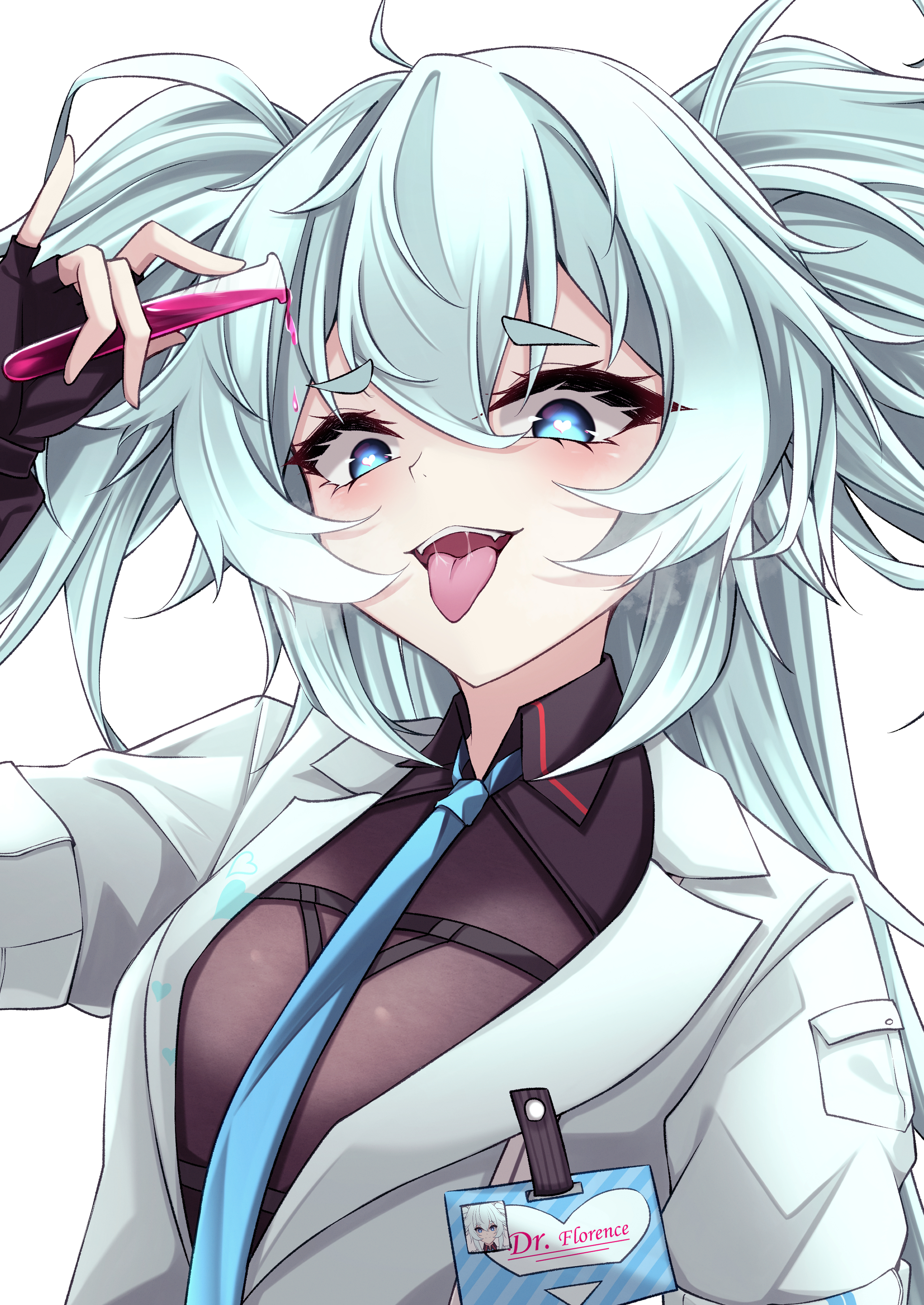 :p1girlblack glovesblack shirtblue eyesblue necktieblushbreastscrazy smilefangsfingerless glovesgloveshair between eyeshand upheartheart-shaped pupilsholdingholding test tubeid cardjacketlong hairmedium breastsnecktieshirtsmilesolosymbol-shaped pupilstest tubetonguetongue outupper bodyvery long hairwhite hairwhite jacket