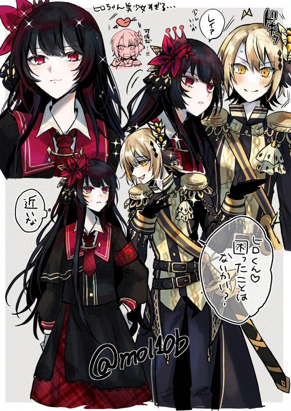 2girlsarrow through heartblack glovesblack hairblack jacketblonde hairclosed mouthcrownepaulettesflowergloveshair flowerhair ornamenthands upjacketlong hairlong sleeveslooking at anotherlooking at viewermol (mol10b)multiple girlsmultiple viewsnecktieopen mouthred eyesred flowerred necktiesashshort hairshoulder sashsmilesparklespeech bubblestandingthought bubbleyellow eyes