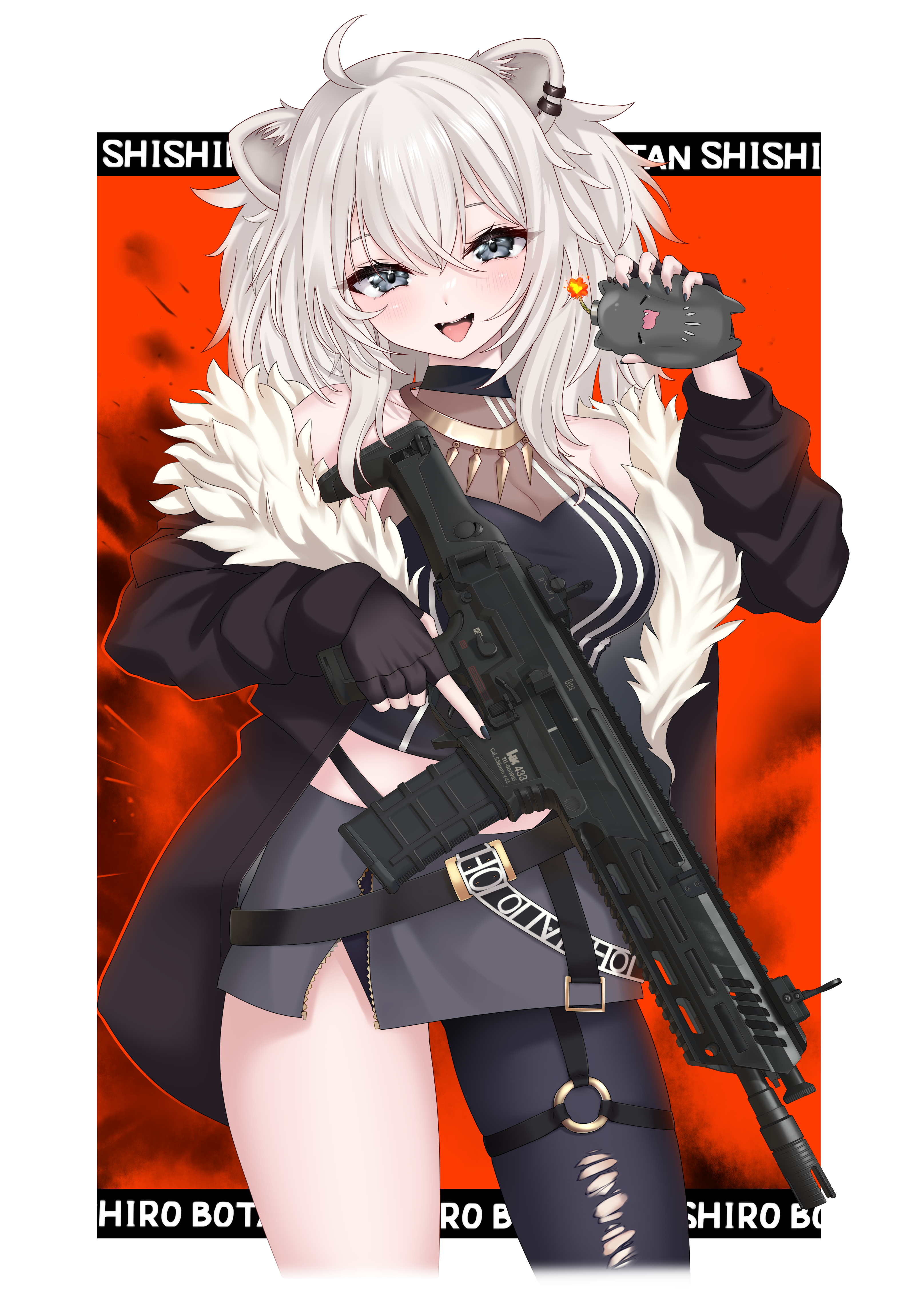1girlahogeanimal earsassault rifleblack jacketblack nailsblack pantyhoseblack shirtblack skirtblushcharacter namefur trimfur-trimmed jacketgrey eyesgrey hairgunholdingholding gunholding weaponjacketlion earslion girllong hairlooking at viewernail polishopen mouthpantyhoserifleshirtsingle leg pantyhoseskirtsolotorn clothestorn pantyhosevirtual youtuberweapon