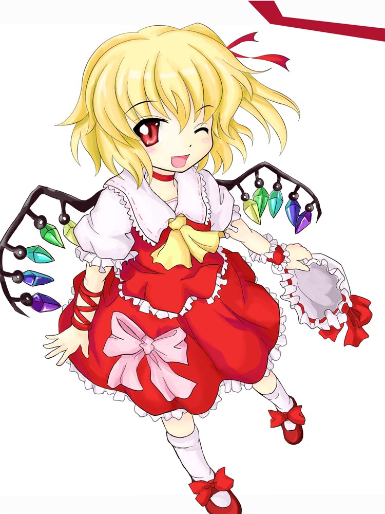 1girlarm ribbonblonde hairbowfemale focushatholdingholding unworn clothesholding unworn hatone eye closedopen mouthred eyesribbonshort hairsimple backgroundsmilesolostandingunworn hatunworn headwearwhite backgroundwingswinkwrist cuffs