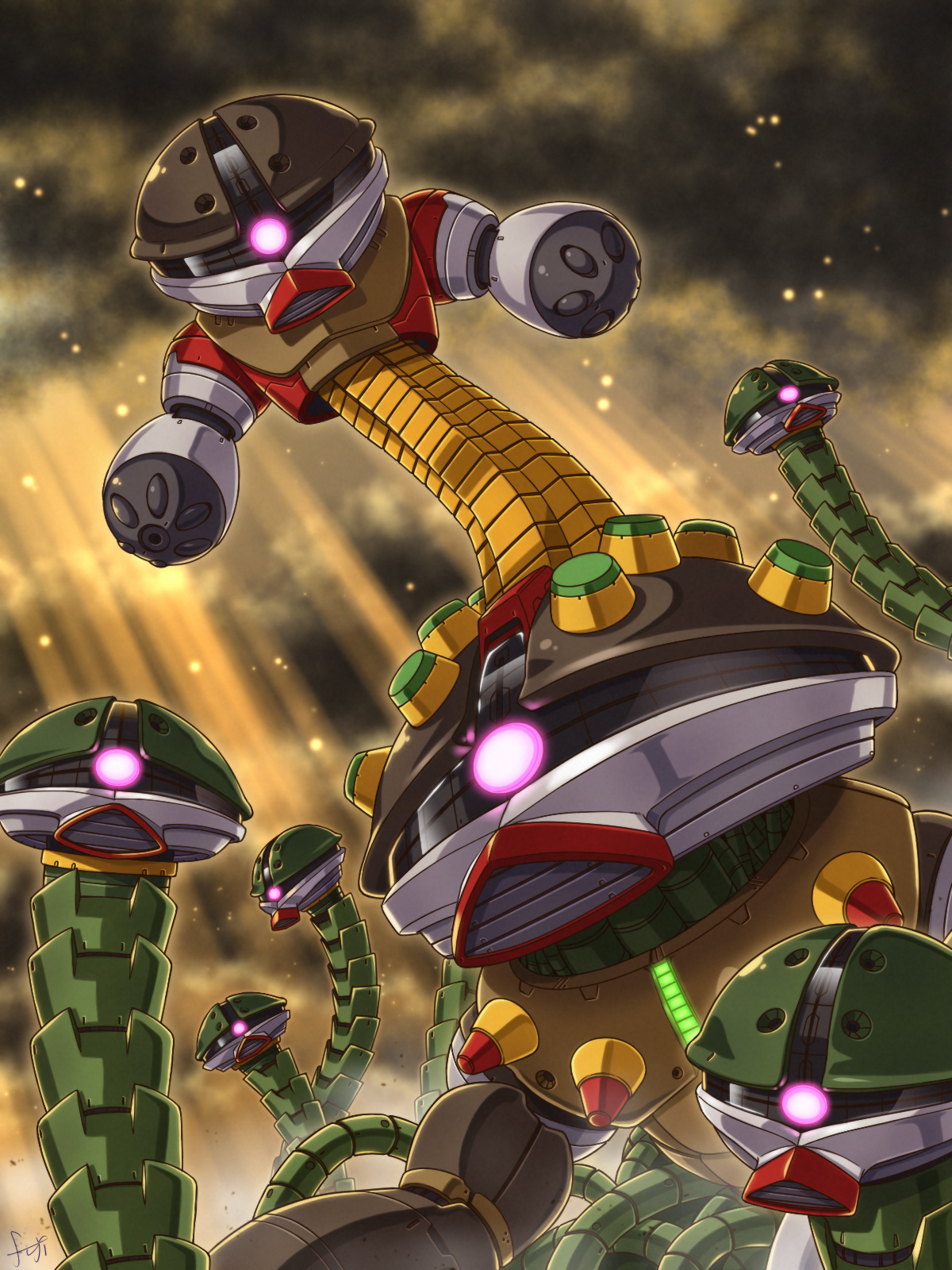 alternate colorartist namecloudcloudy skyembersglowingglowing eyegundam headjointslight rayslooking at viewermechamobile suitno fingersno humansno pupilsone-eyedoutdoorsparodypink eyesrobotrobot jointsscience fictionsignatureskysunbeamsunlight