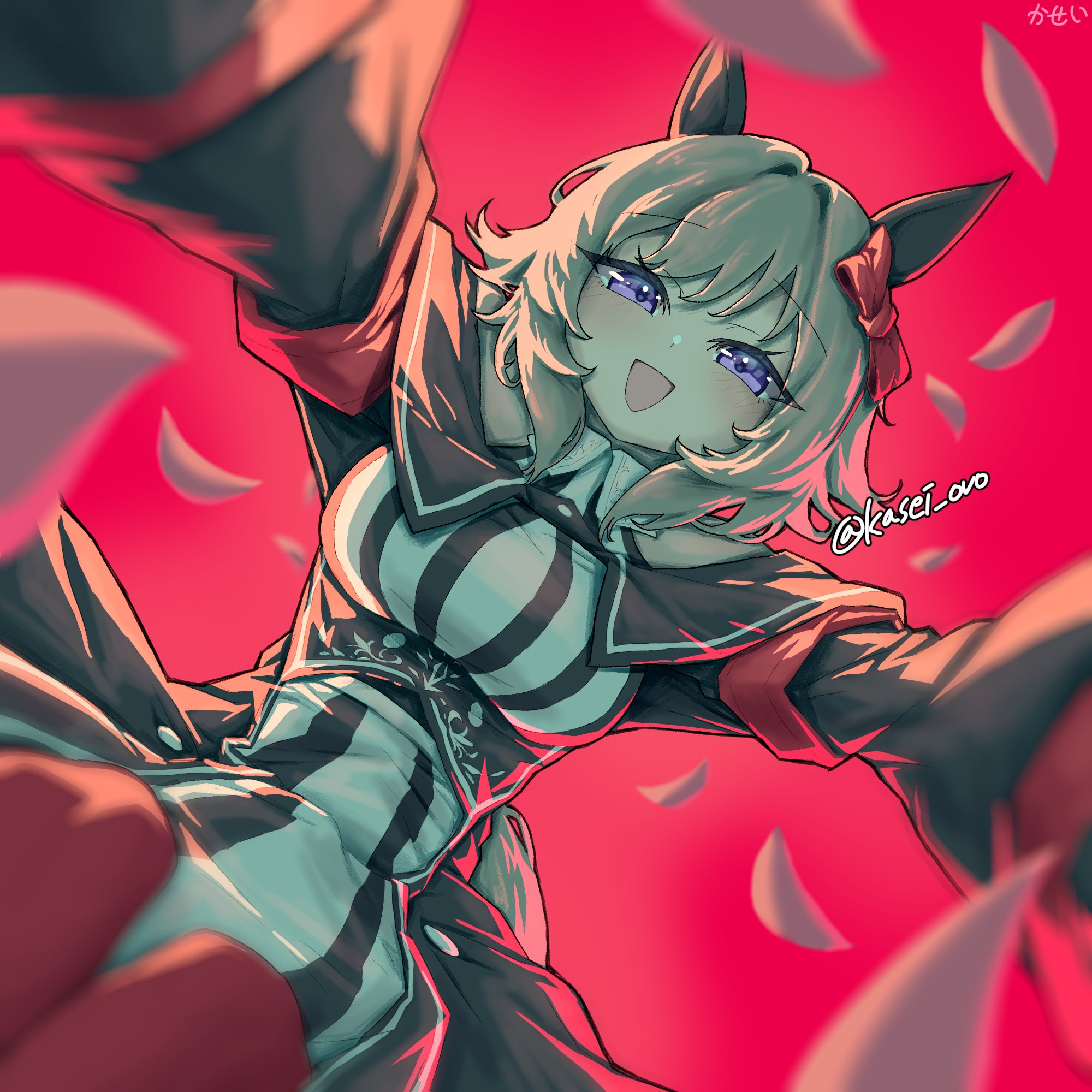 1girlanimal earsbare shouldersblushbowbreastscoatdressear bowear coversgrey hairhair between eyeshorse earshorse girlhorse taillarge breastslong sleeveslooking at vieweroff shoulderoff-shoulder coatoff-shoulder dressoff-shoulder jacketopen mouthoutstretched armspetalspurple eyesred backgroundred bowshort hairsimple backgroundsmilesolostriped clothesstriped dresstailvertical-striped clothesvertical-striped dress