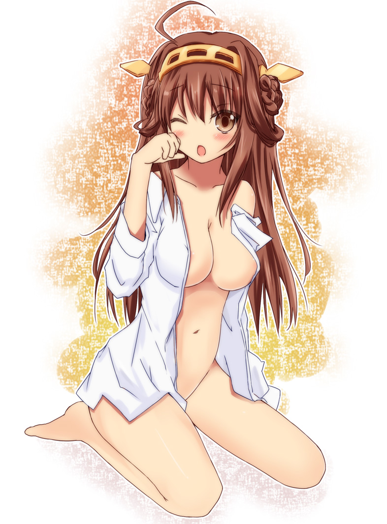 :oahogeareola slipareolaebarefootblushbreastsbrown hairfemaleFlag for Deletionhairbandlong hairnavelopen clothesopen mouthopen shirtpersonificationsittingwarizawink