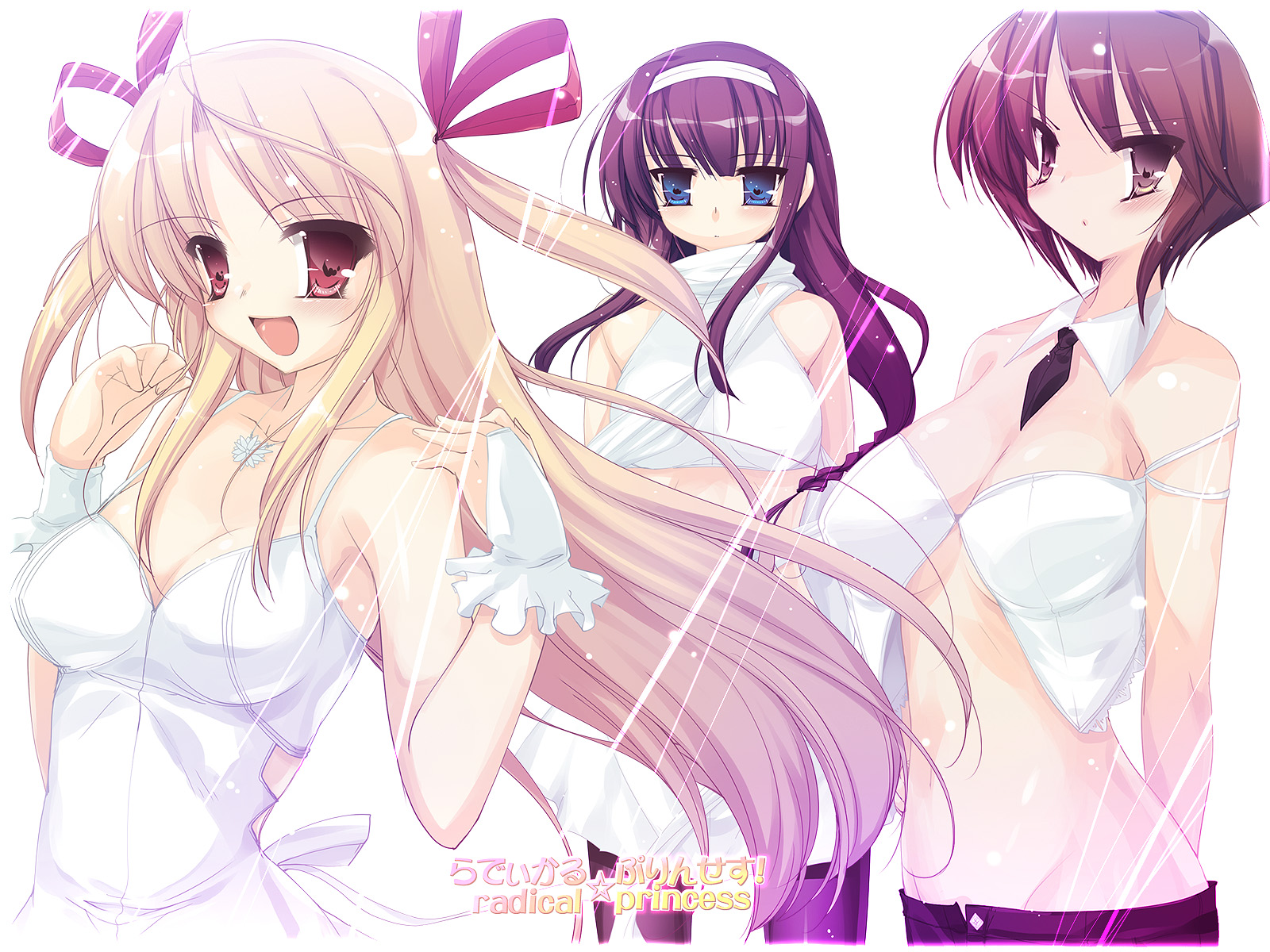 blonde hairblue eyesbreastsbrown eyescleavagedresslarge breastsmidriffopen mouthpurple hairred eyesred hair
