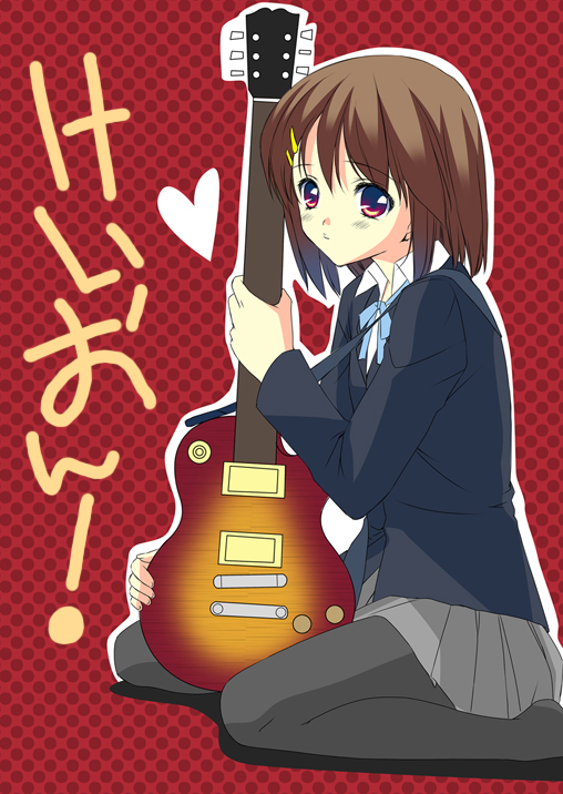 00s1boy1girlblack pantyhoseblushbrown hairclosed mouthdot noseelectric guitarfemale focusgibson les paulguitarhair ornamenthairclipheart (symbol)holdingholding guitarholding instrumentinstrumentlooking at viewermedium hairno shoespantyhosered backgroundsakuragaoka high school uniformschool uniformsolo