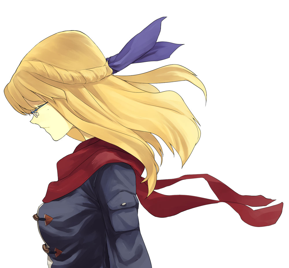 1girlblonde hairclosed eyescoatfemale focusfloating hairglasseslong hairred scarfscarfsimple backgroundsoloupper bodywhite backgroundwind