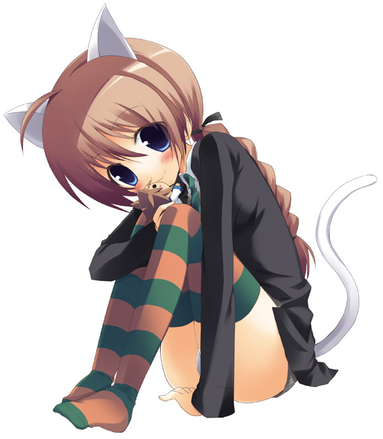 00s1girlanimal earsblue eyesblushbraidbrown hairfeetfemale focuslong hairsingle braidsmilesolostriped clothesstriped thighhighstailthighhighs