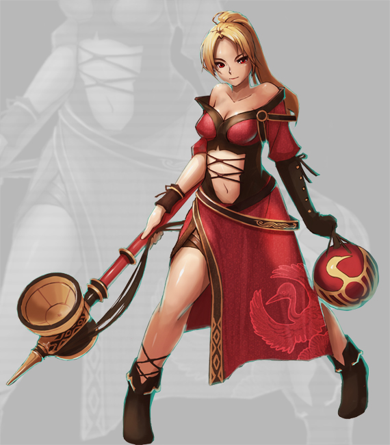 1girlbare shouldersblonde hairbreastscleavagefemale focusmedium breastsponytailred eyessoloweapon