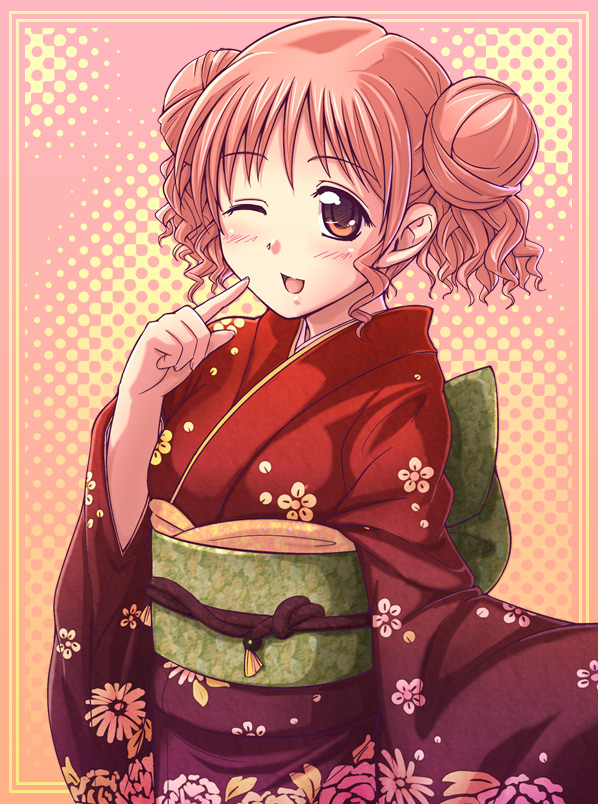 00s1girlblushdouble bunfemale focushair bunhalftonehalftone backgroundjapanese clotheskimonoone eye closedopen mouthpink hairshort hairsolo