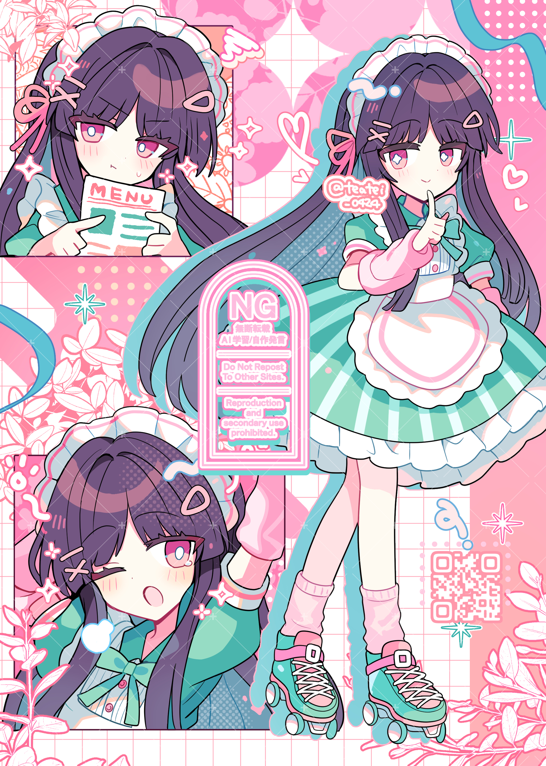 :o:t1girlapronarm warmersblushbright pupilsbrown hairclosed mouthcollared dresscontrast collarcross-shaped pupilsdressfrilled apronfrilled dressfrillsfull bodygreen dressgreen ribbongreen shoeshair ornamenthaircliphand upholdingholding menuindex finger raisedlong hairlooking at viewermaid headdressmenumultiple viewsneck ribbonone eye closedopen mouthpink eyespink sockspuff of airpuffy short sleevespuffy sleevesqr coderibbonroller skatesshoesshort sleevesskatessmilesocksstandingstretchingsweatdropsymbol-shaped pupilstwitter usernamewatermarkwhite apronwhite pupilsx hair ornament