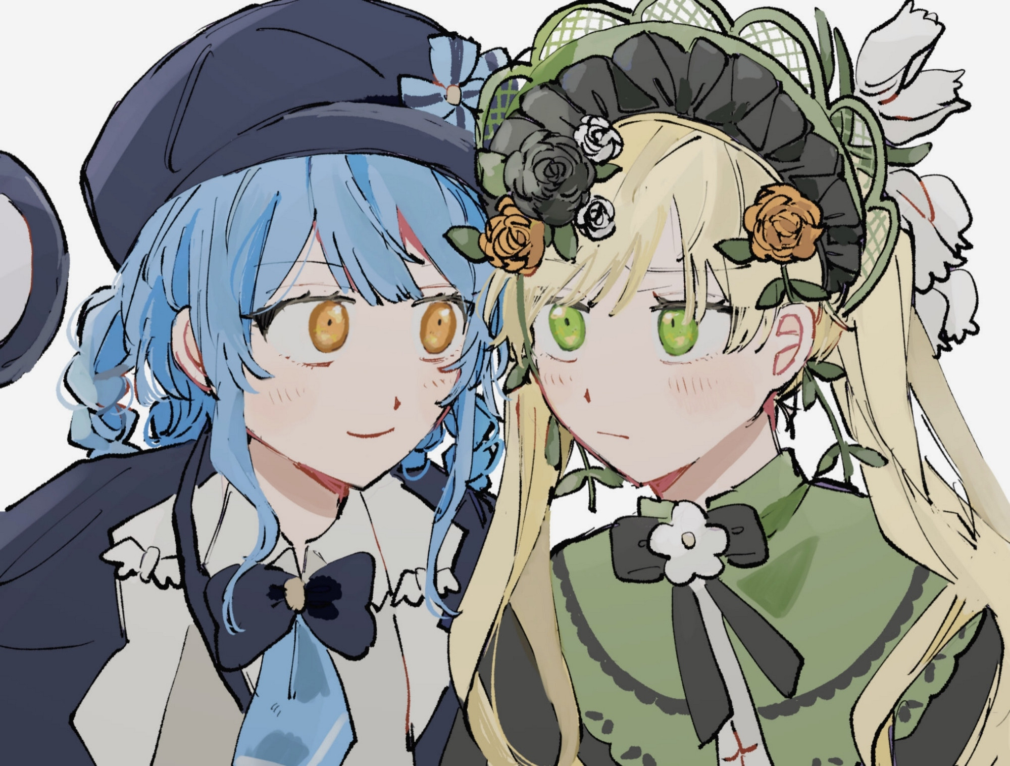 2girlsblack bowblack capeletblack flowerblack hatblack roseblonde hairblue hairbonnetbowbraidbraided hair ringscapeletclosed mouthdeerstalkereye contactflowergreen bonnetgreen eyeshair flowerhair ornamenthair ringshatlolita fashionlong hairlooking at anothermahoshi (etzqf30)multiple girlsroseshort hairsimple backgroundsmiletwintailsupper bodywhite backgroundyellow eyesyellow floweryellow rose