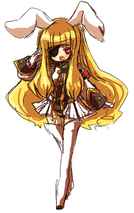 00s1girlanimal earsblonde hairblusheyepatchfemale focuslong hairrabbit earsred eyesshowgirl skirtsketchsolothighhighszettai ryouiki