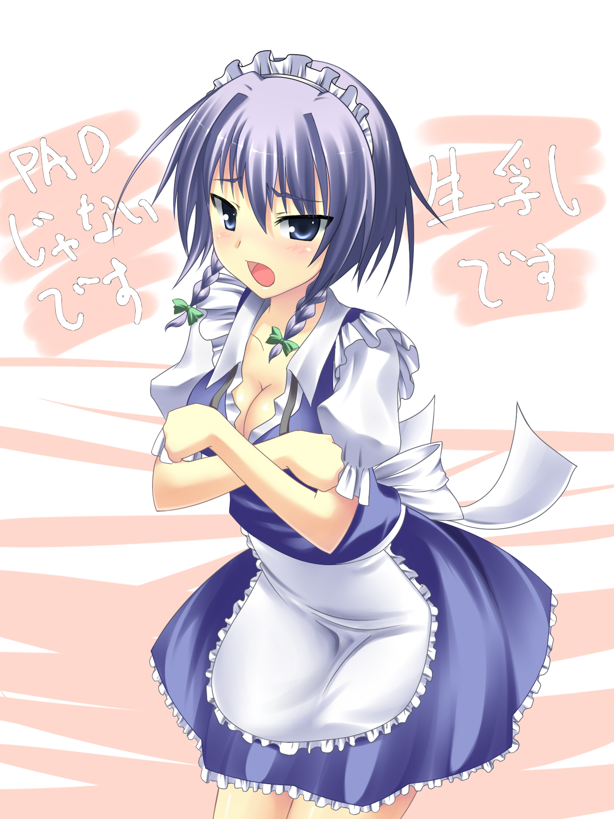 1girlapronblushbraidbreastscleavagecrossed armsfemale focusleaning forwardmaidmaid apronmaid headdressopen mouthshort hairsolotsurimetwin braids