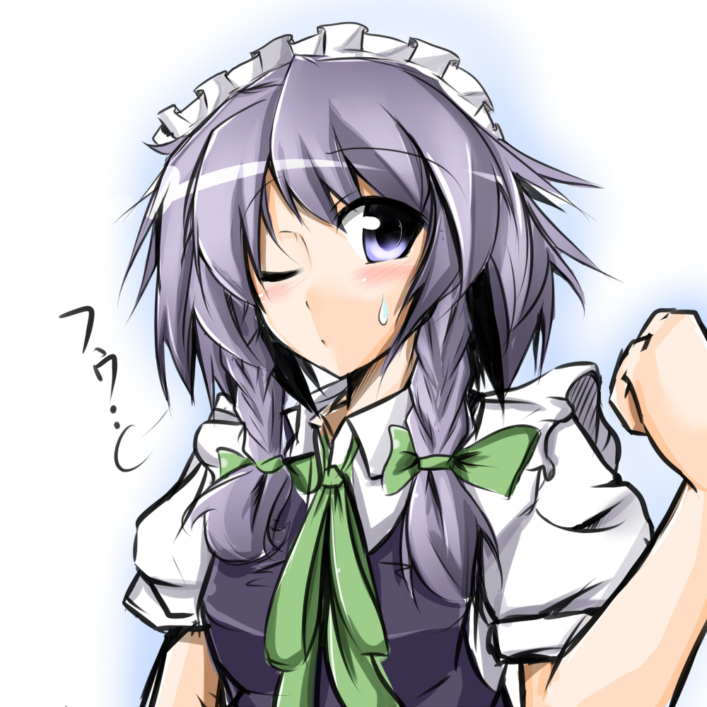 1girlblue eyesblushbraidfemale focusgradient backgroundmaidmaid headdressone eye closedpurple hairsolosweatdroptwin braidsupper bodywhite backgroundwink