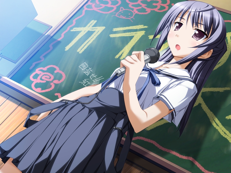 1girlblue hairchalkboarddutch anglefemale focuslong hairmicrophonepurple eyesschool uniformsolosuspenders hanging