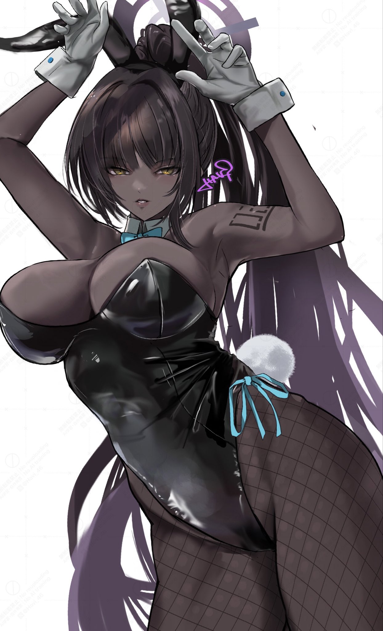 1girlanimal earsarm tattoobare shouldersblack hairblack leotardblue bowblue bowtiebowbowtiebreastscleavagecovered naveldark skindark-skinned femaledetached collarfake animal earsfake tailfishnet pantyhosefishnetsglovesgradient hairgroinhalohighleghighleg leotardlarge breastsleotardlong hairlooking at viewermulticolored hairnumber tattoopantyhoseparted lipsplayboy bunnyponytailpurple hairpurple halorabbit earsrabbit tailsolotailtattoovery long hairwhite gloveswrist cuffsyellow eyes