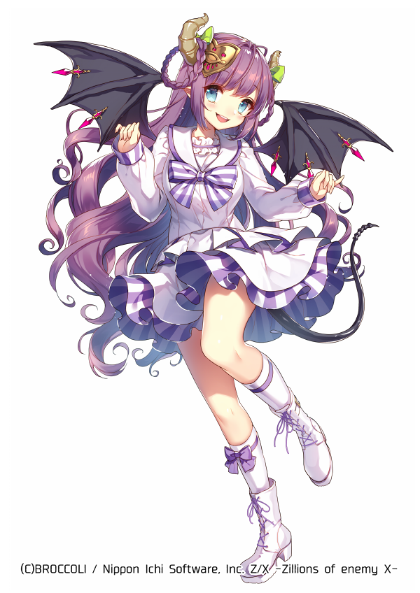 1girlblue eyesbowbow legwearbraidbraided hair ringsbrown hornscopyright noticedemon girldemon hornsdemon taildemon wingsfrilled skirtfrillsgreen bowhair bowhair ornamenthair ringshornslong hairlooking at vieweropen mouthpurple bowpurple hairshirtshoesskirtsockssolostandingstanding on one legtailteethugly (z/x)upper teeth onlywhite backgroundwhite shirtwhite shoeswhite skirtwhite sockswings