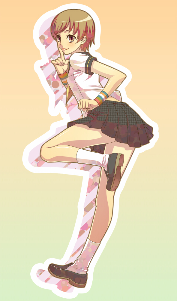 kimarin, 1girl, artist name, blush, chair, checkered floor, female focus, gloves, maid, maid headdress, on chair, pantyhose, perspective, sitting, sitting backwards, smile, solo, twintails