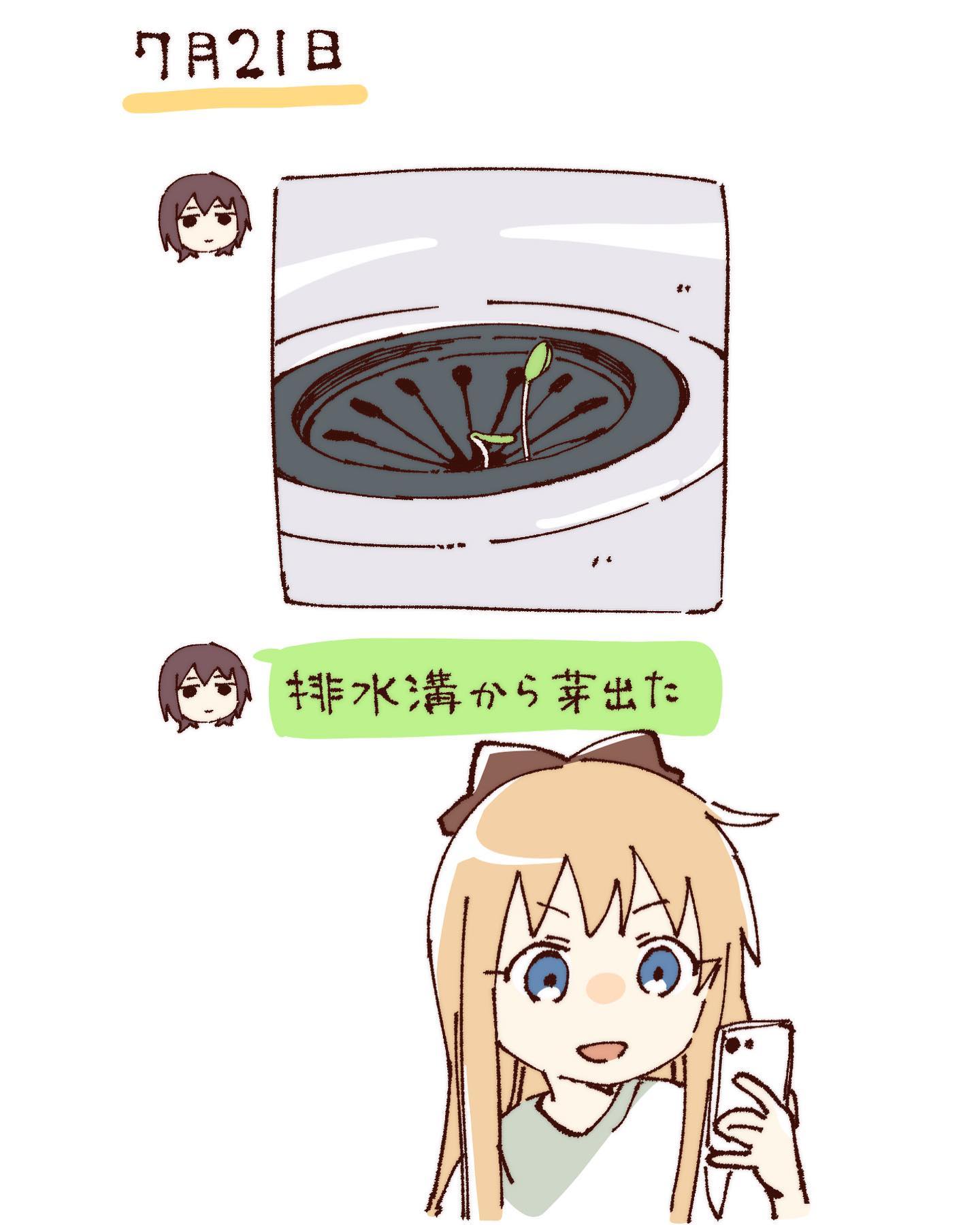 2girlsblonde hairblue eyesbowbrown bowcellphonechibichibi insetclosed mouthhair bowholdingholding phonelong hairmultiple girlsopen mouthphoneshirtsimple backgroundsinksmartphonespeech bubblesprouttext messagingwhite backgroundwhite shirt