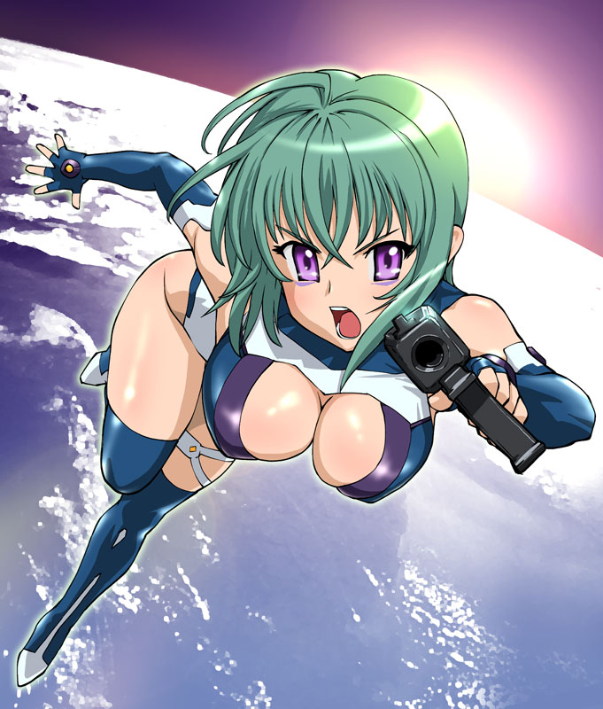 aile (mega man zx), capcom, mega man (series), mega man zx, 1girl, :o, bare legs, blue one-piece swimsuit, brown hair, cameltoe, contrapposto, covered navel, crop top, cropped jacket, crossed arms, dot nose, facing viewer, female focus, furrowed brow, gloves, gradient background, green eyes, looking at viewer, lowleg, no pants, one-piece swimsuit, open mouth, pink background, school swimsuit, short hair, short sleeves, solo, standing, swimsuit, swimsuit under clothes, tareme, taremw, white background