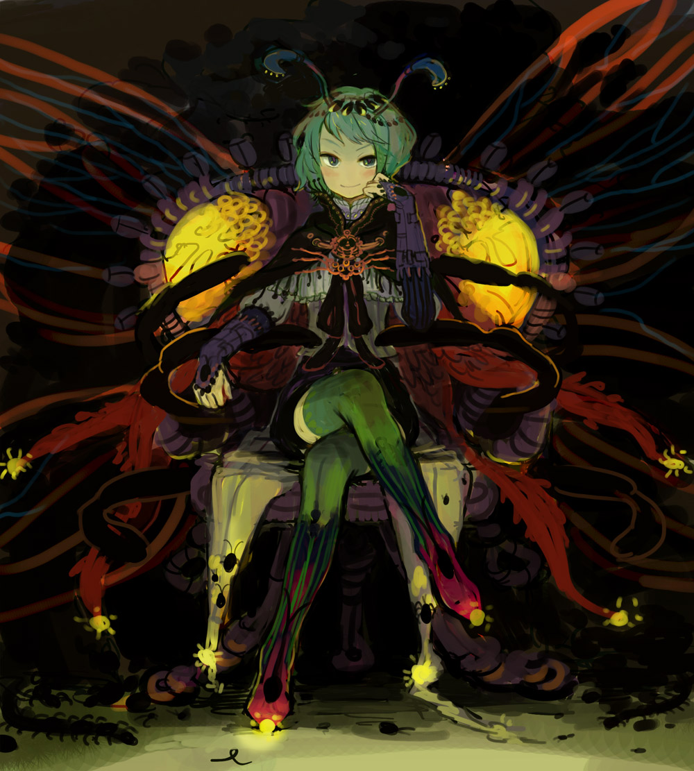 yukimura tsubame, yasaka kanako, touhou, 1girl, female focus, hair ornament, leaf hair ornament, rope, shimenawa, solo