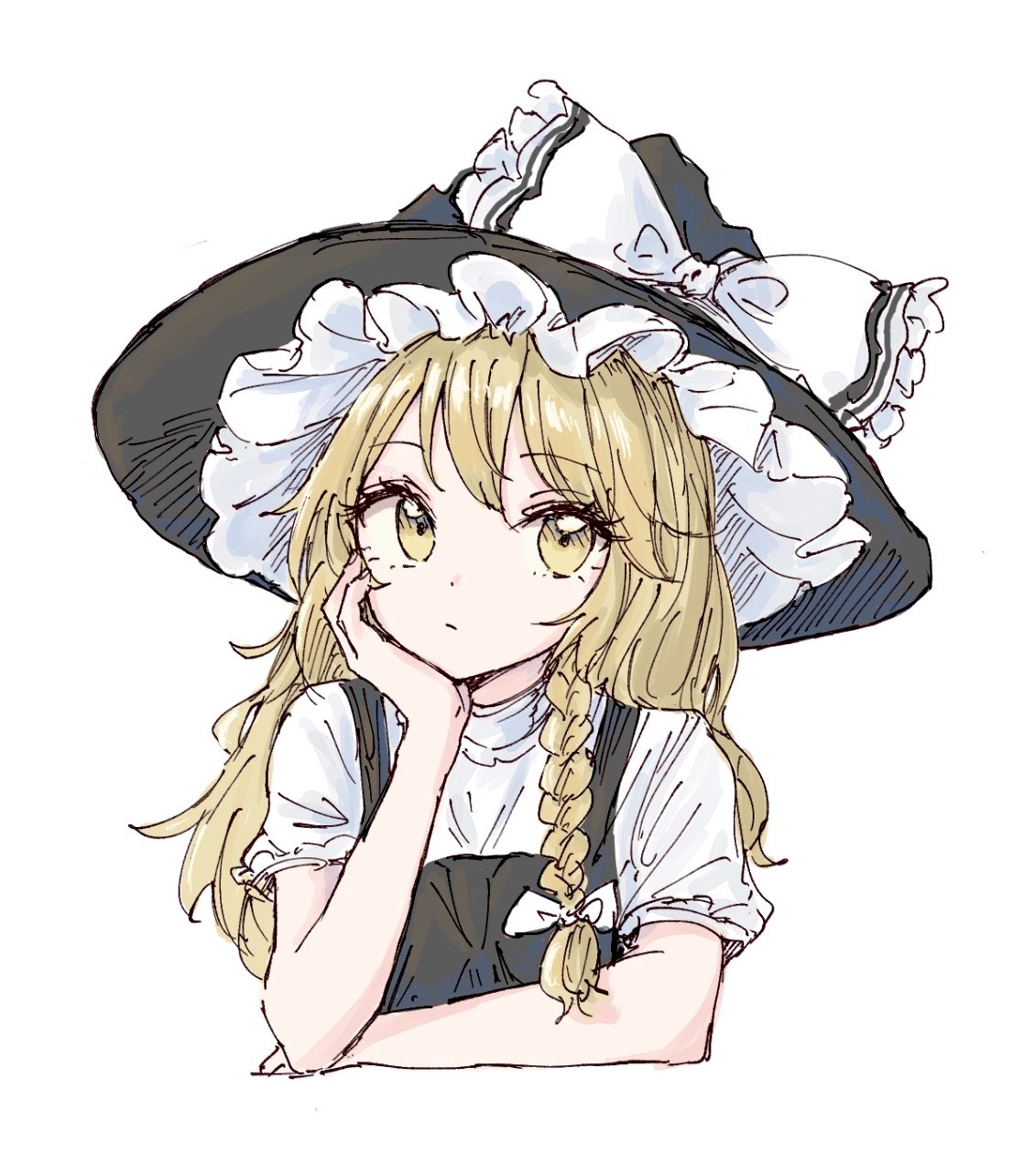 1girlapronblonde hairbowbraiddresshand on own chinhathat bowlong hairshort sleevessingle braidsoloupper bodywhite backgroundwitch hatyellow eyes