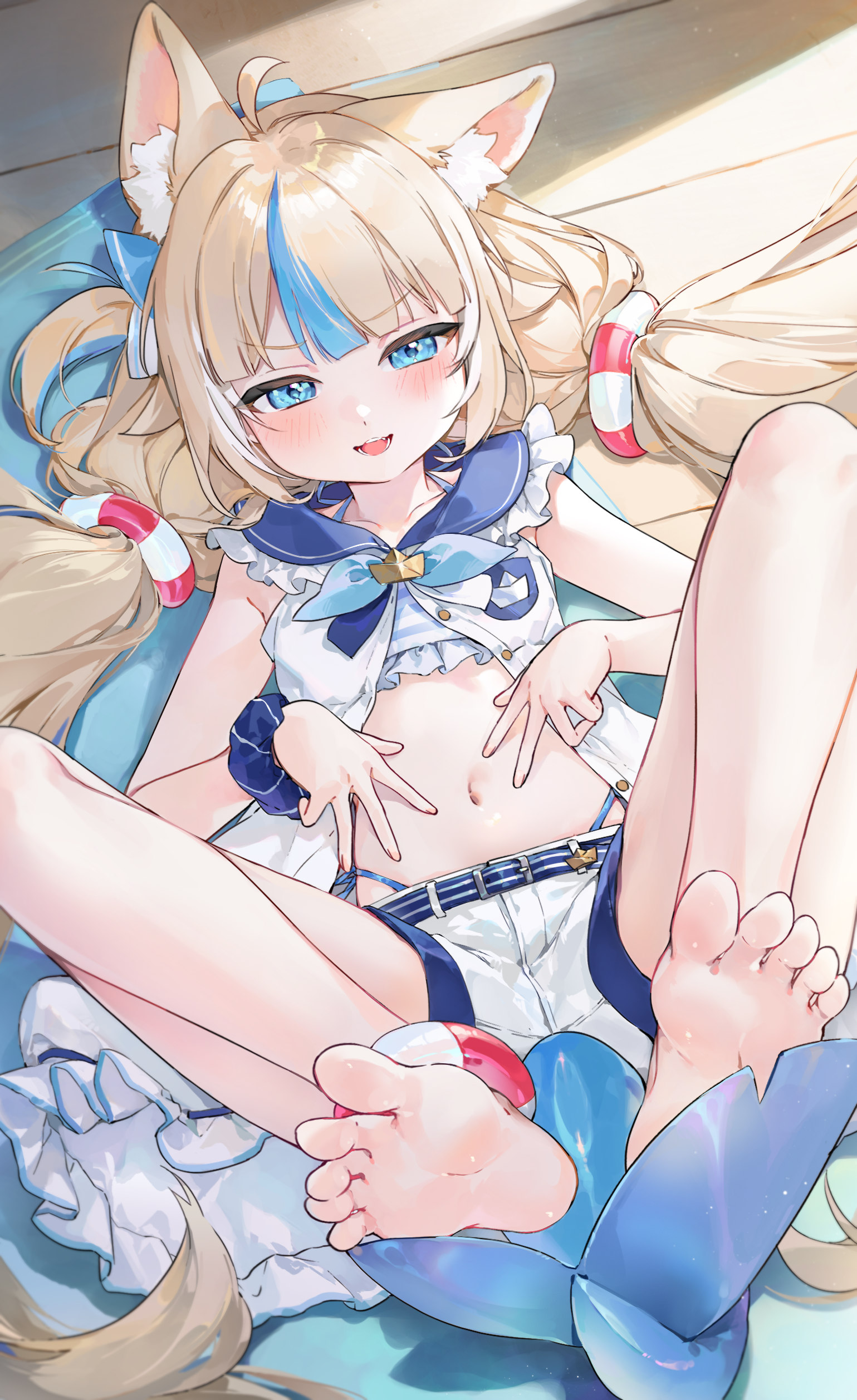 1girlahogeanimal ear fluffanimal earsbarefootblonde hairblue eyesblue hairblue sailor collarblue streaksblushcat earsdressfeetfinsfish girlfish tailfrilled sailor collarfrillsfrom abovehand on own stomachlifebuoy ankletlifebuoy hair ornamentlong hairlooking at viewerlyingmulticolored hairnavelon backopen clothesopen dressopen mouthsailor collarshortssmilesolessolostreaked hairtailtoestwintailswhite dresswooden floor
