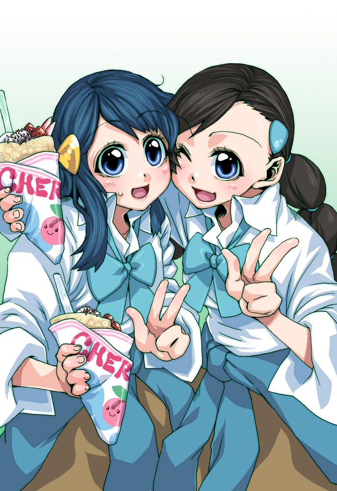 00s2girlsblack hairblue eyesblue hairblushbrown haircheek-to-cheekclothes around waistcrepedesserteyeshadowfoodgen 4 pokemongym leaderhair ornamenthairclipheads togetherlipsticklong hairmakeupmulti-tied hairmultiple girlsone eye closedpokemon (creature)ribbonsweatersweater around waistvwink