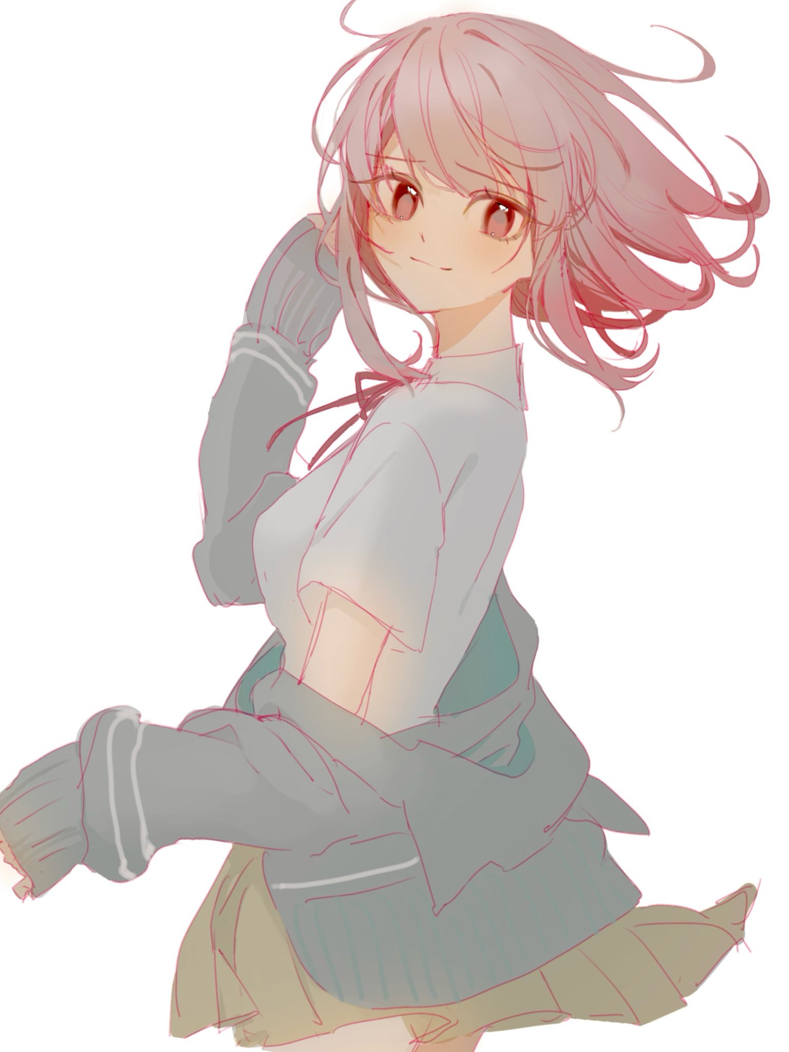 1girlbreastsbrown hairbrown skirtcho koko-kyu no washicollared shirtflipped hairhair ornamenthoodjacketlong sleeveslooking at viewermedium hairneck ribbonopen clothesopen jacketpink eyespink ribbonpleated skirtribbonshirtshort sleevesskirtsmilesolowhite shirt
