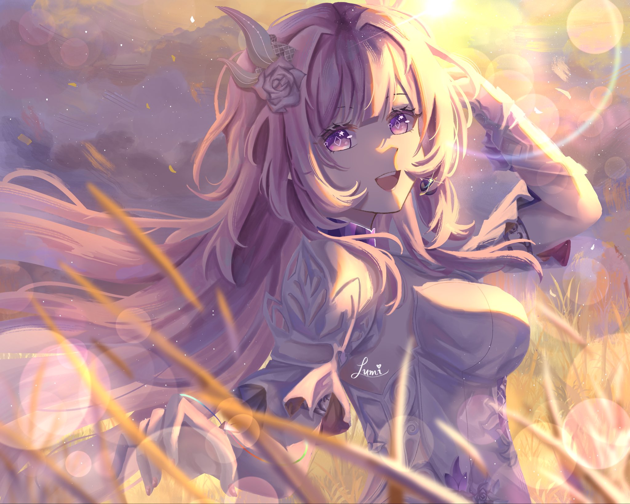 1girlartist namebreastsdiamond (shape)diamond-shaped pupilsdressearringsjewelrylarge breastslong hairluminieeopen mouthoutdoorspink hairpurple eyessmilesolosunlightsymbol-shaped pupilsteethupper teeth onlyvery long hairwheatwheat fieldwhite dress