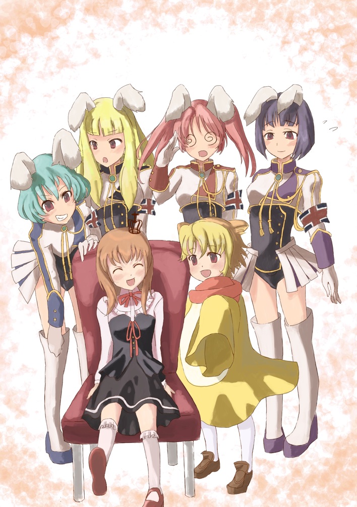 00s1boy5girlsanimal earsarmbandblonde hairblue hairblushchildclosed eyescrowneyepatchhappylong hairmultiple girlspink hairrabbit earsred eyesshowgirl skirtsmilethighhighs
