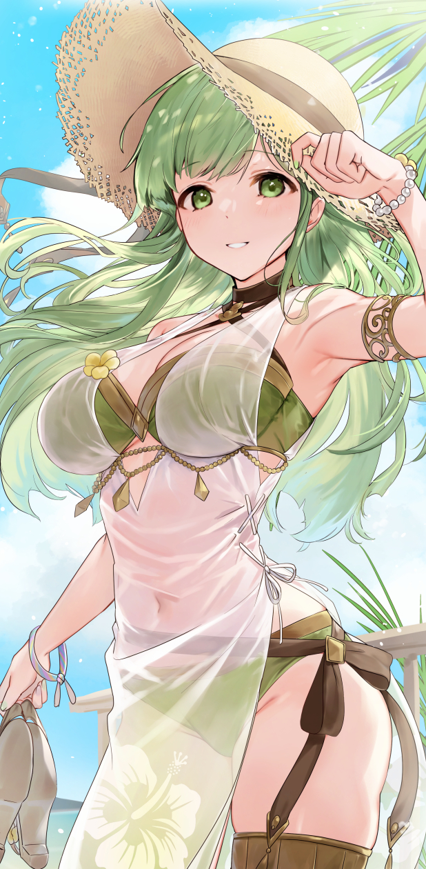 1girlarm uparmpitsbikiniblue skybraceletbreastscleavagecloudcovered naveldaygreen bikinigreen eyesgreen hairgreen nailshatjewelrylooking at viewernail polishofficial alternate costumeoutdoorsparted lipspearl braceletsee-through clothesskindentationskysmilesolostandingsun hatswimsuitthighswide hips