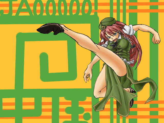1girlblue eyesbraidchina dresschinese clothesdressfemale focushathigh kickkickingred hairsolotwin braids