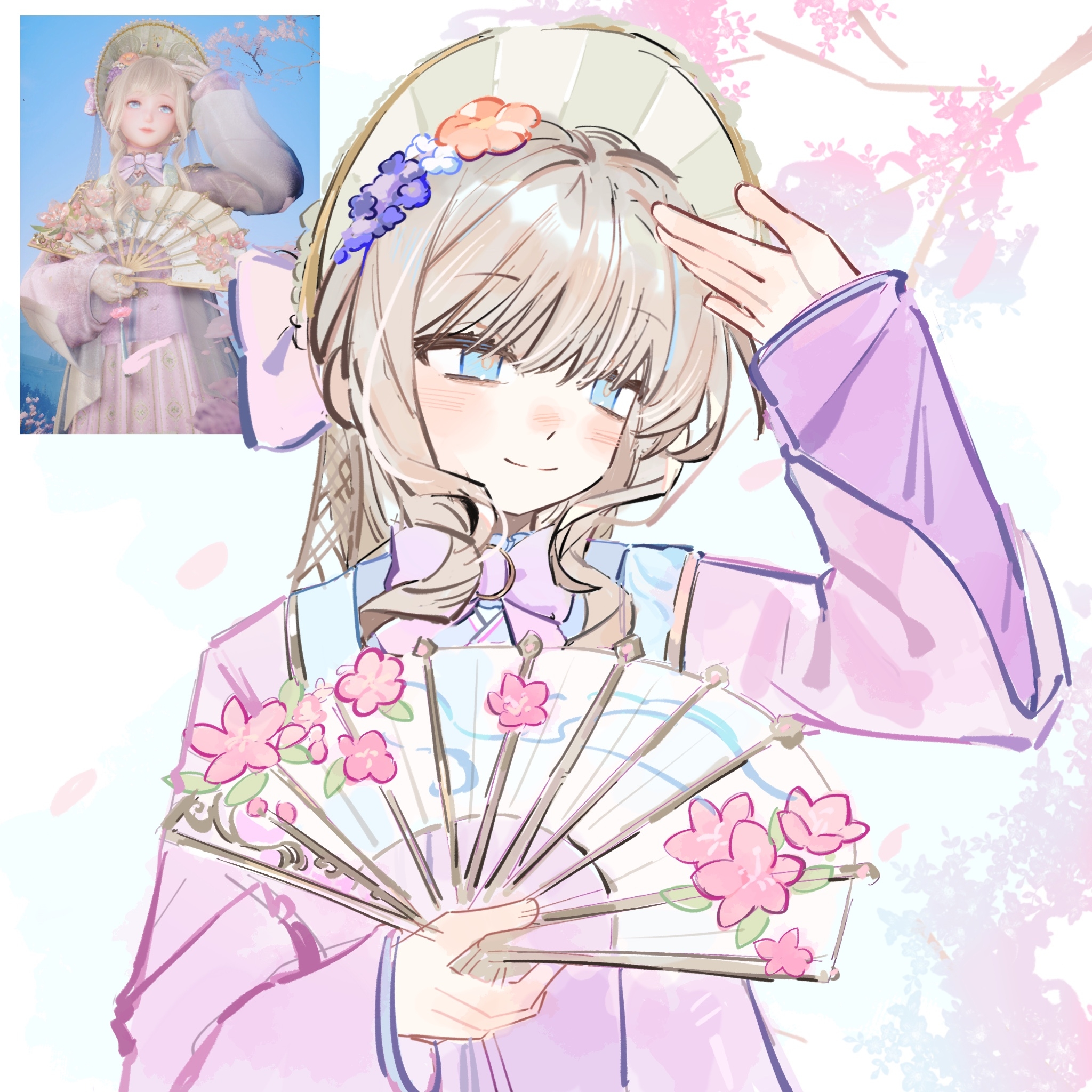 1girlblue eyesbowbowtiebranchbrown haircherry blossomsclosed mouthdaydot noseeyelashesflowerfolding fangame screenshot insetgreen bonnethair flowerhair ornamenthand fanhand on own headhappyhathat bowholdingholding fanlight blushlong hairlong sleeveslooking aheadorange floweroutdoorspetalspurple bowpurple bowtiepurple flowerpurple hanfusidelockssleeves past wristssmilesolospring (season)striped clothesstriped headwearstylist (nikki)upper bodyvertical-striped clothesvertical-striped headwearwavy hairwhite backgroundwhite flowerwisteria