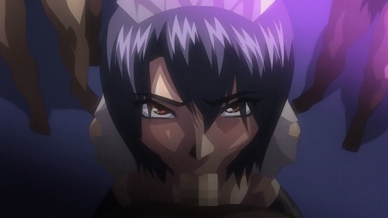 kouda tomohiro, jakuri (ar tonelico), ar tonelico, ar tonelico ii, gust, 00s, 1girl, bed, black hair, blush, bottomless, female focus, legs, long hair, naked shirt, no pants, open mouth, purple eyes, raglan sleeves, red eyes, shirt, sitting, solo, t-shirt
