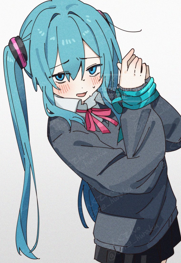 1girlblack skirtblue eyesblue hairblue ribbonblushboundbound wristscowboy shotdouble-parted bangsgrey sweaterhair between eyeslong hairlooking at viewerneck ribbonopen mouthpink ribbonpleated skirtribbonschool uniformsimple backgroundskirtsolosweatertwintailswatermarkwhite backgroundwing collar