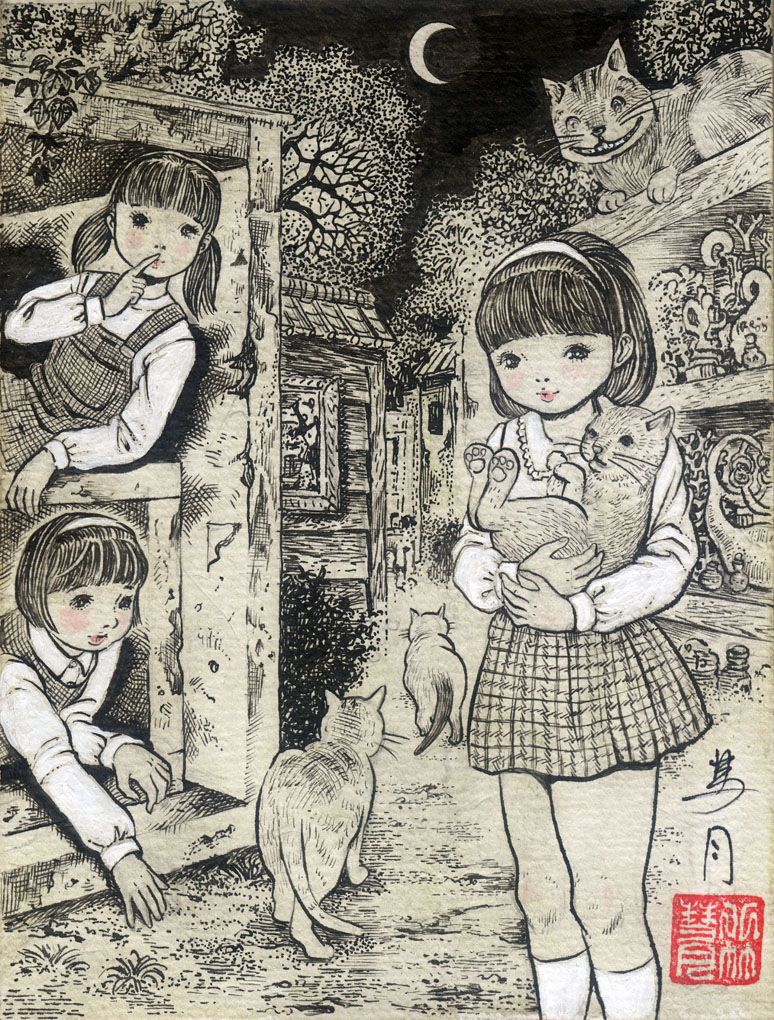akasaka saki, aoba kozue, mahoraba, 00s, monochrome, school uniform, serafuku, sketch, thighhighs