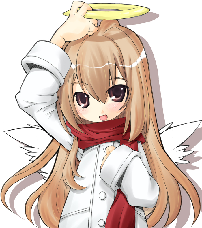 00sangelblushbrown eyesbrown haircoathaloholding halolong hairscarfsmilesolotraditional halowings