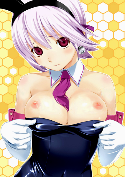 1girlanimal earsbreastsclothes pullelbow glovesfake animal earsfemale focusgloveslarge breastsnecktienipplesplayboy bunnypurple hairrabbit earsred eyesshirt pullsolo