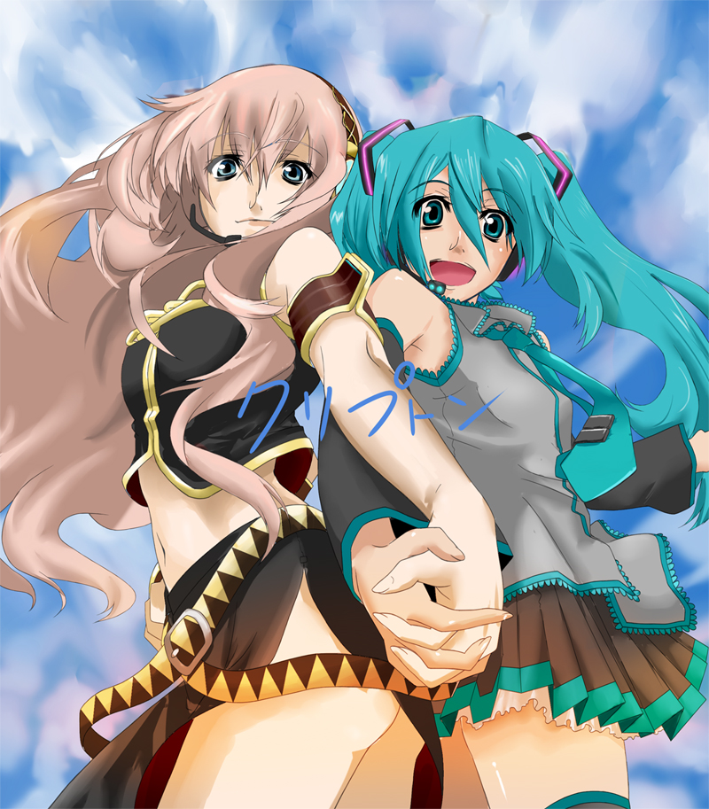 2girlsaqua eyesaqua hairback-to-backblue eyesdaydetached sleevesgreen eyesgreen hairholding handslion (macross frontier)long hairmidriffmultiple girlsnavelnecktieopen mouthparodypink hairpleated skirtskirtskysmilethighhighstwintails