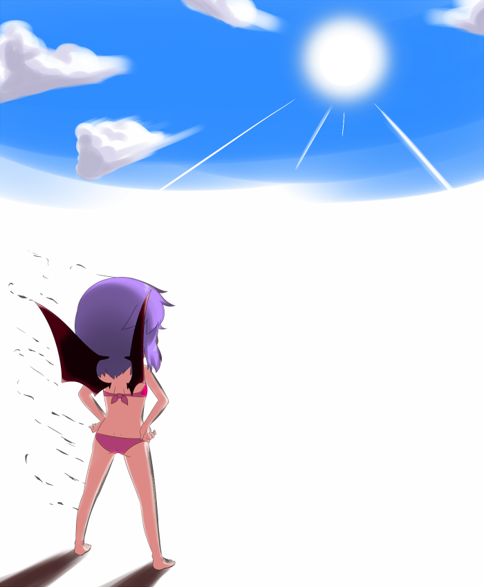 1girlbarefootbat wingsbikinidaydisintegrationfemale focushands on own hipsshort hairsolosunswimsuitvampirewings