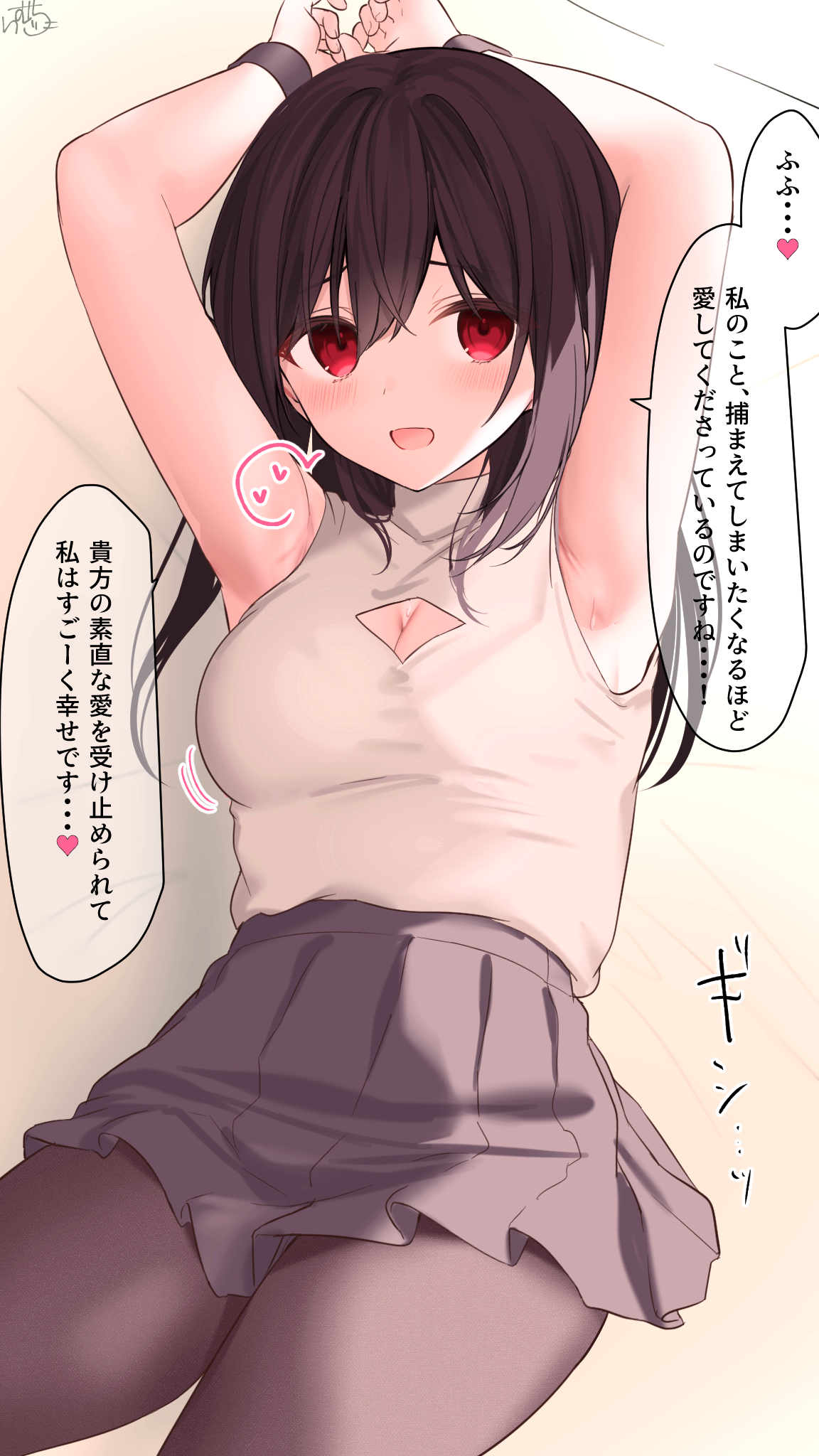 1girlarmpitsarms behind headarms upbdsmblack hairbondageboundbreastscleavagecleavage cutoutclothing cutoutgrey skirthair between eyesheartlong hairlooking at viewerparted lipsred eyesskirtsleevelesssmilesolospeech bubblespoken heartsweatthighhighs
