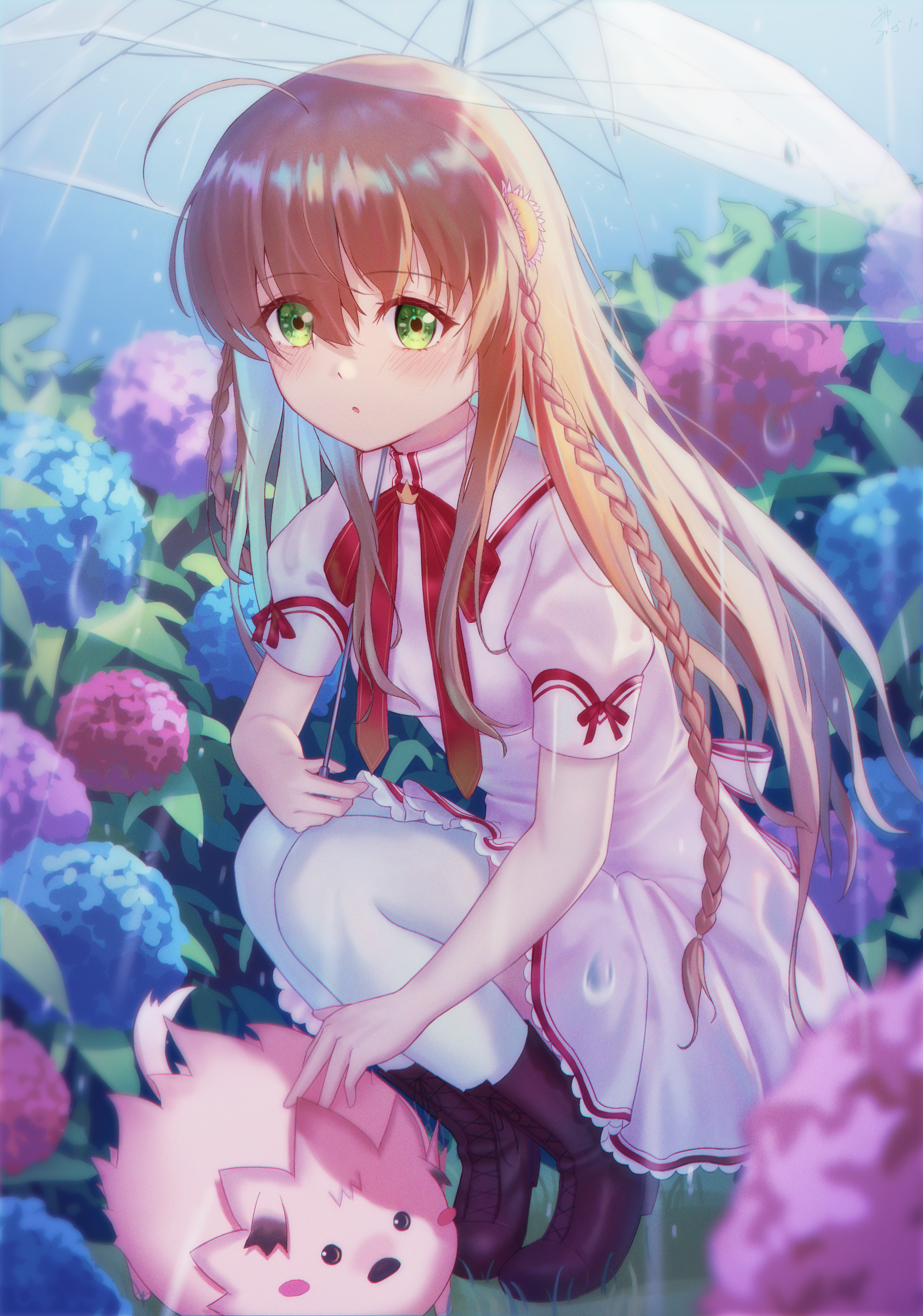 :o1girlahogebacklightingblue flowerblurryblushblush stickersbootsbowbraidbrown bootsbrown haircrowndaydepth of fielddresseyelasheseyes visible through hairfilm grainflowerfrilled dressfrillsfull bodygardengreen eyeshair between eyeshair flowerhair ornamentholdingholding umbrellahydrangeakazamatsuri institute high school uniformlace-up bootslong hairlooking at viewermini crownneck ribbonoutdoorsparted lipspink dresspink flowerpuffy short sleevespuffy sleevespurple flowerrainred bowred ribbonribbonschool uniformshort dressshort sleevessidelockssleeve bowsolosquattingsummer uniformthighhighstransparenttransparent umbrellatwin braidsumbrellaunder umbrellavery long hairwhite thighhighs