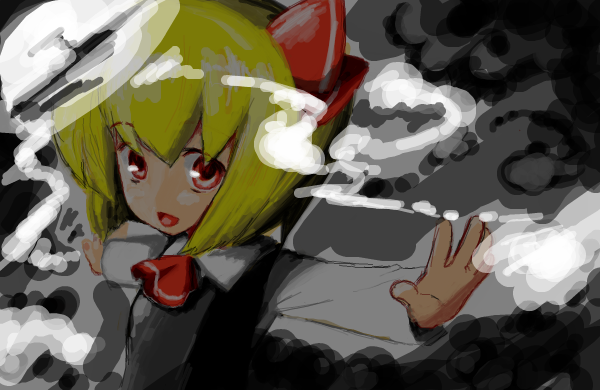 hisona (suaritesumi), watatsuki no toyohime, touhou, commentary request, 1girl, ;), blonde hair, brown dress, closed mouth, collared dress, cropped legs, dress, grey background, hand fan, hat, holding, holding fan, long hair, long sleeves, looking at viewer, mob cap, one eye closed, orange eyes, simple background, smile, solo, white dress, white hat