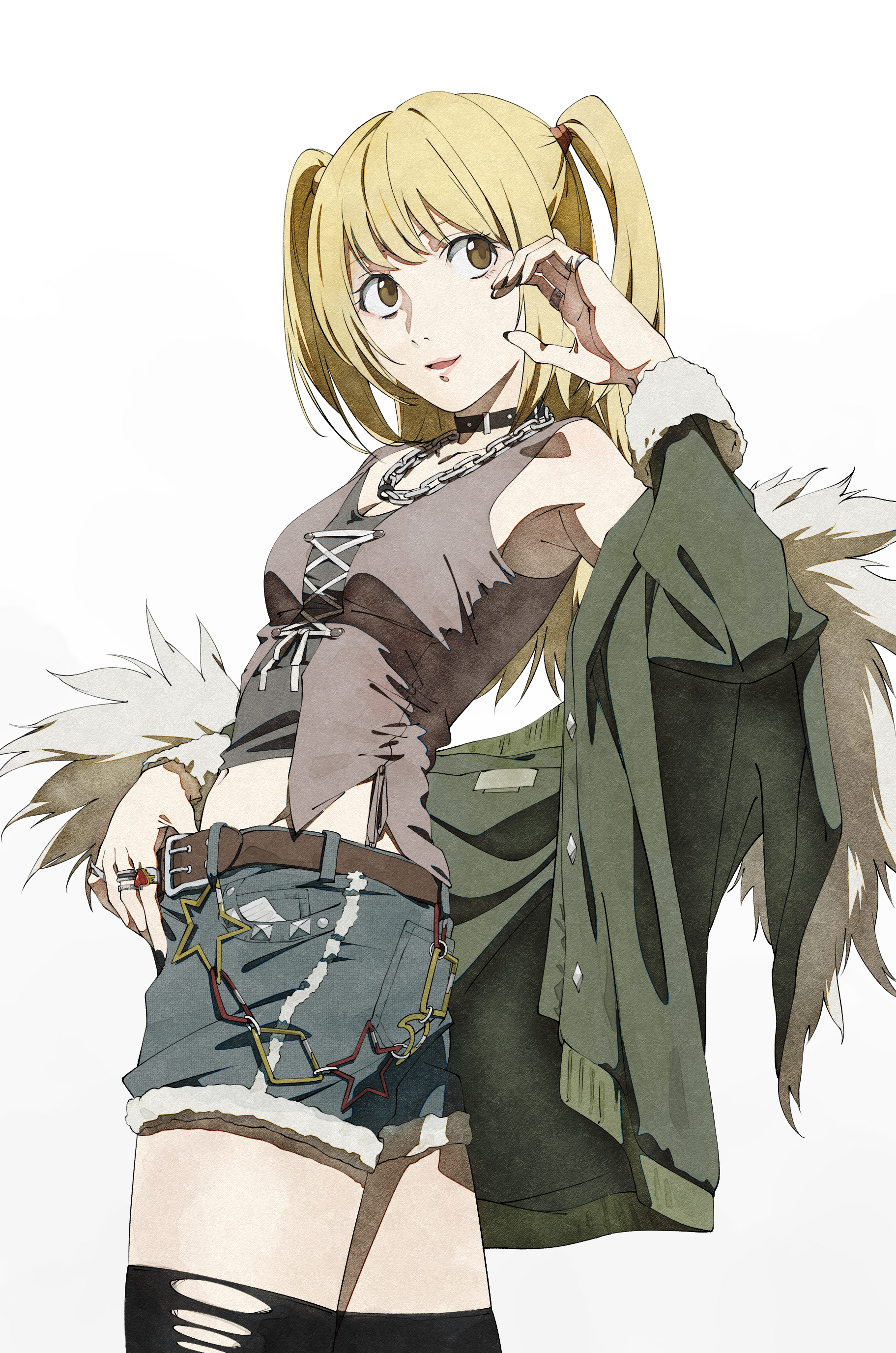 1girlbare shouldersbeltblack chokerblack nailsblack thighhighsblonde hairblue shortsbreastsbrown beltbrown eyesbrown shirtchokercleavageclosed mouthcowboy shotfingernailsgreen jacketjacketjewelrylong fingernailslong hairlong sleeveslooking to the sidemedium breastsnail polishopen clothesopen jacketringshirtshort shortsshortssimple backgroundsleevelesssleeveless shirtsolostandingthighhighstorn clothestorn thighhighstwintailswhite background